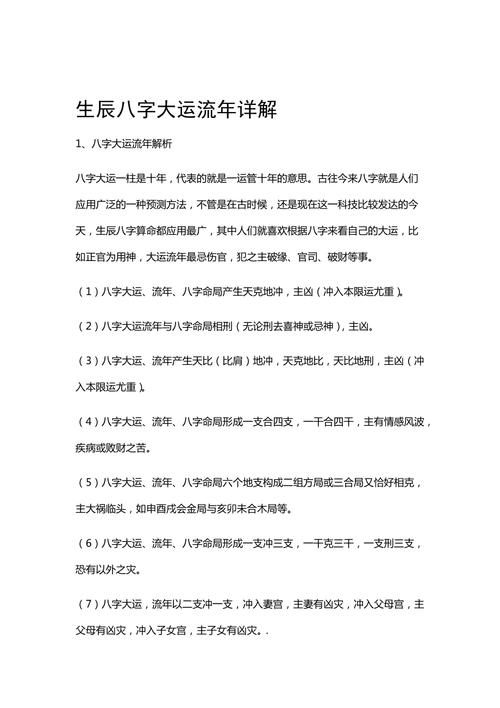 起运数:大运数的起法,以三天折合一岁计,即一天折合四个月,一小时折合五天.计算时,如起运总数为18天,被3除,等于6,即为6岁起大运.如为19天,则为6岁4个月起大运.每十年行一步大运.起运天数的计算,是以出生之日所在月令,分男女顺逆算出.阳年生男,男命以出生之日数至本月令结束,如辰月生人,其月令为清明之月,清明结束之时,即立夏巳月交节前夕.如九五年四月二十一日生男,阳年生男从二十一日数至五月初九清明节令结束,立夏开始,共十七天,除3等于从5岁零八个月开始行大运.如果这一天生女,从二十一逆数至四月初九,即立夏开始之日,共14天,除3等于从4岁零八个月行大运.阴年生女同阳年生男,阴年生男同阳年生女.
